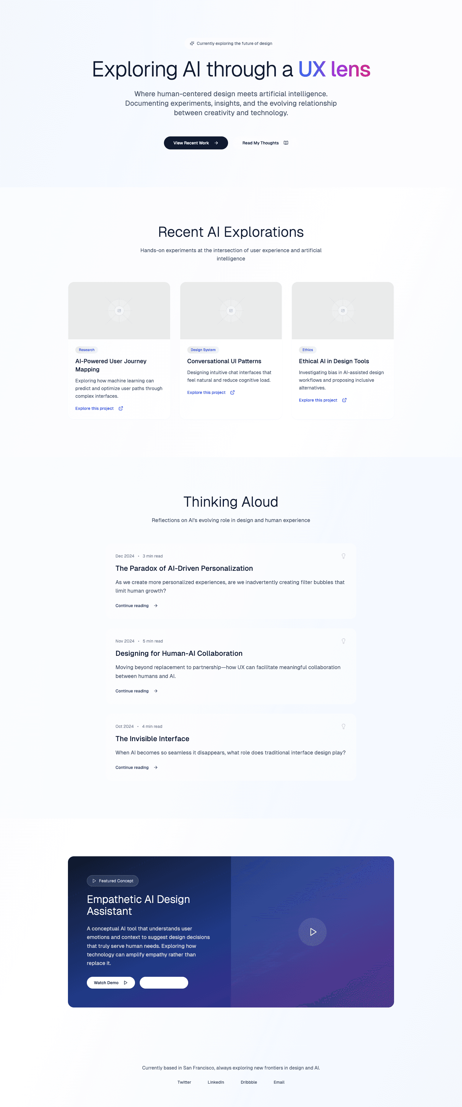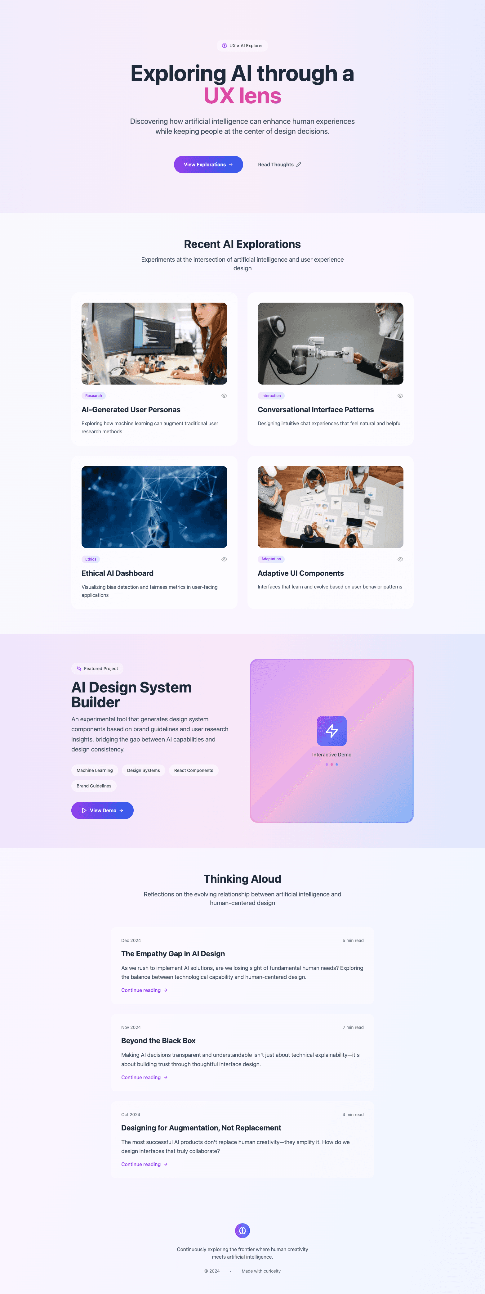 • A hero section with a short headline like ‘Exploring AI through a UX lens’, a sub-headline, and a subtle call to action.