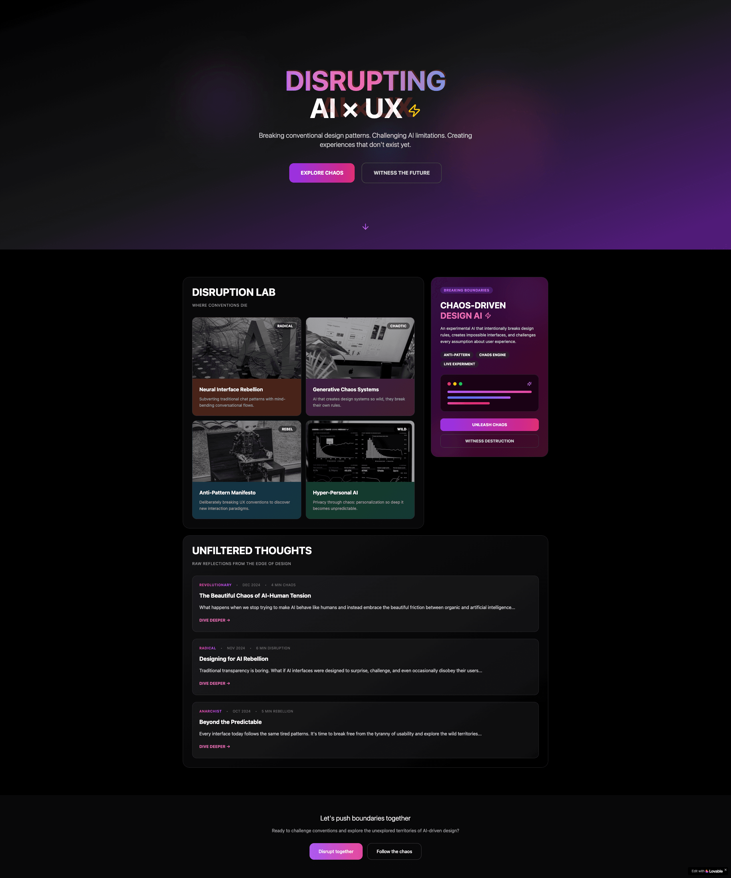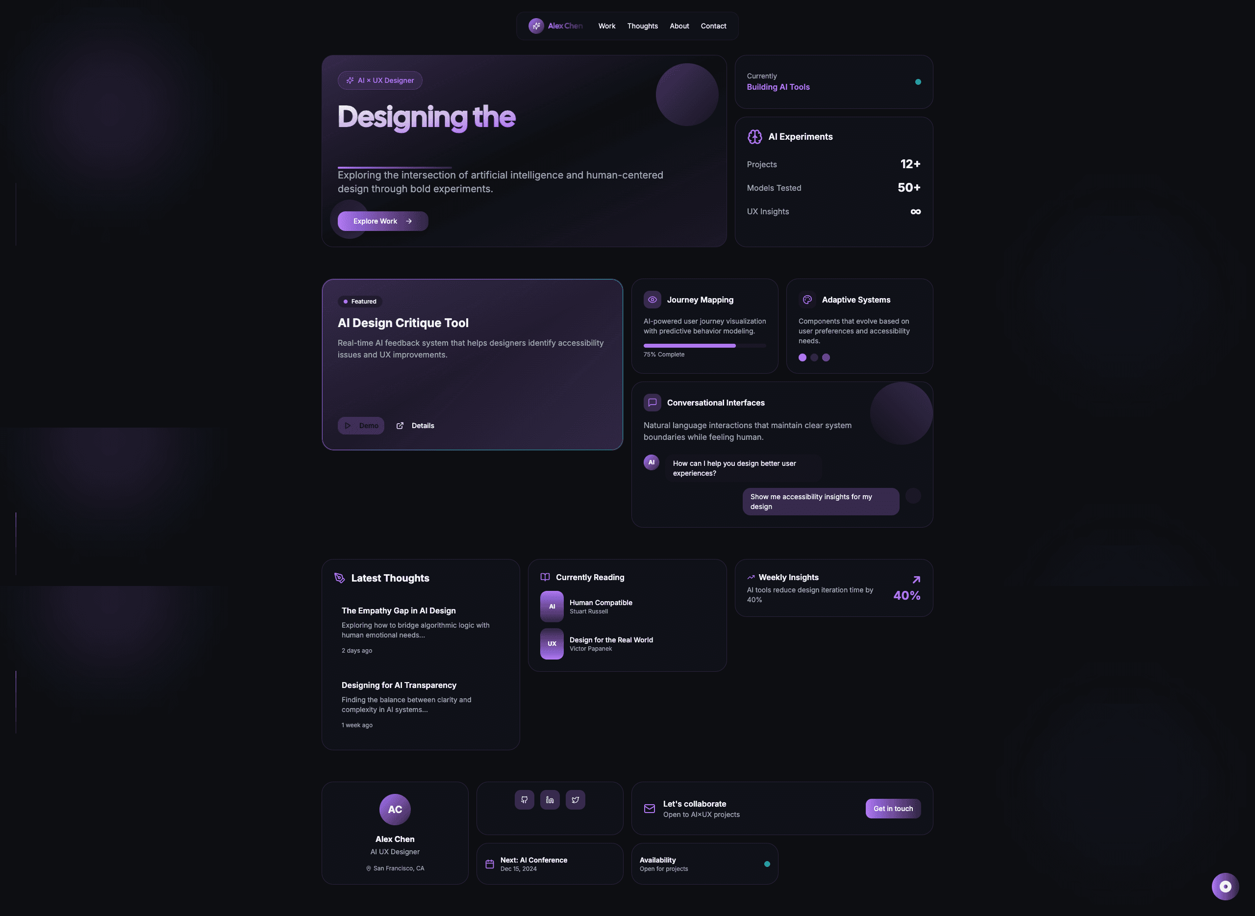 • A section called ‘Thinking Aloud’ for sharing thoughts or short essays about AI’s role in design, with minimal typography and space to breathe…